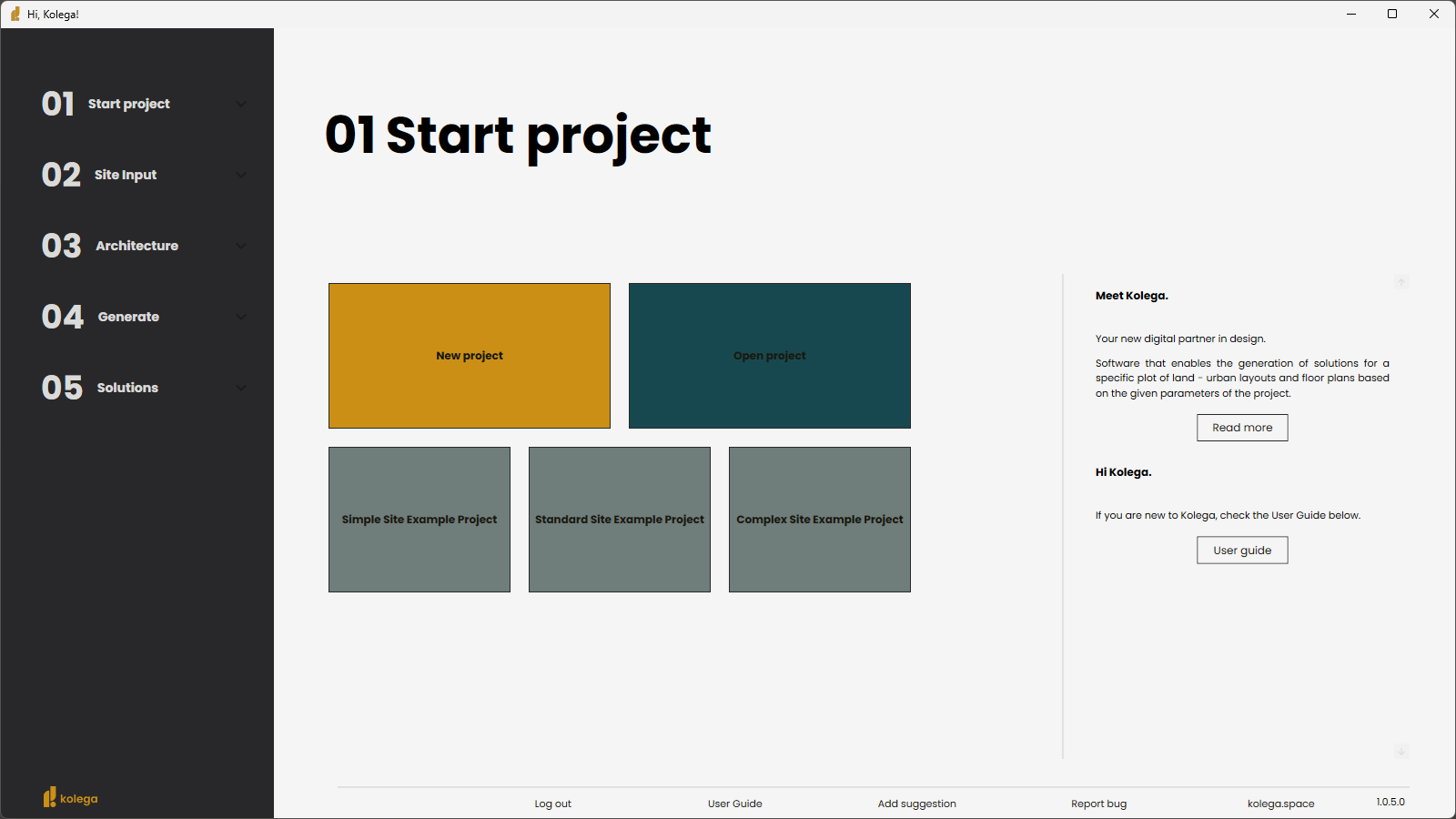 You will be asked to enter a name for the project (this will also be used to name the project folder), a short description (optional) and location where to save the files. Once these details have been completed, the project will be created and Kolega will proceed to the Site Info screen.