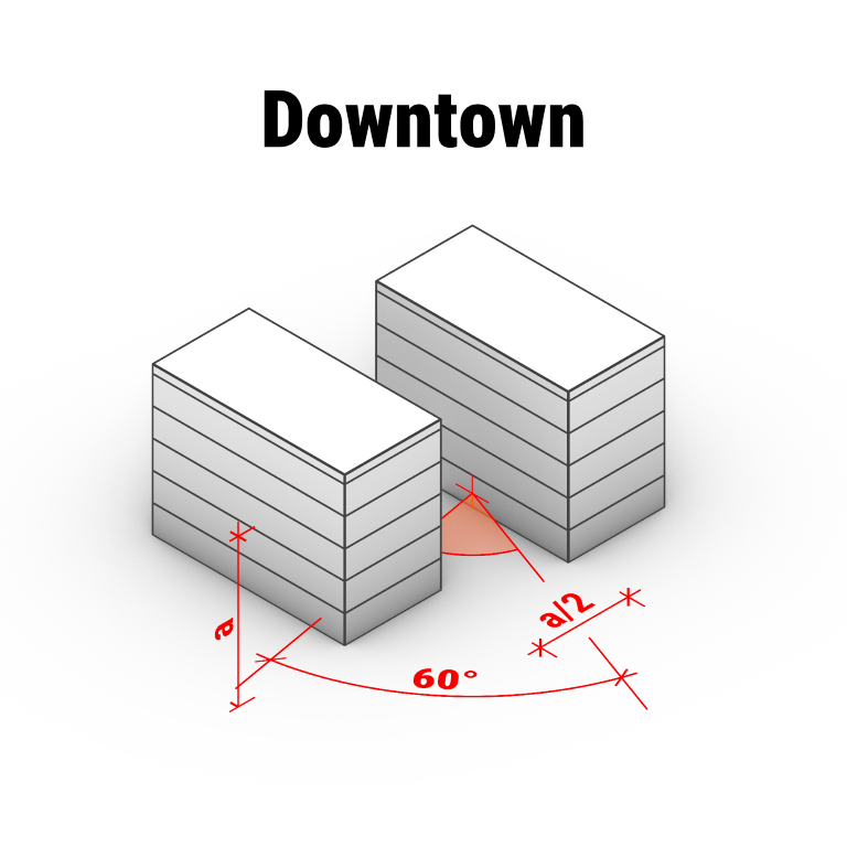 Enable the Downtown option when a ptoject is located in a dense urban center. Activating this option allows a wall with windows to be positioned at a distance equal to half the height of the opposite building. The height is measured from the window sill of the analyzed building to the highest point of the opposite building.